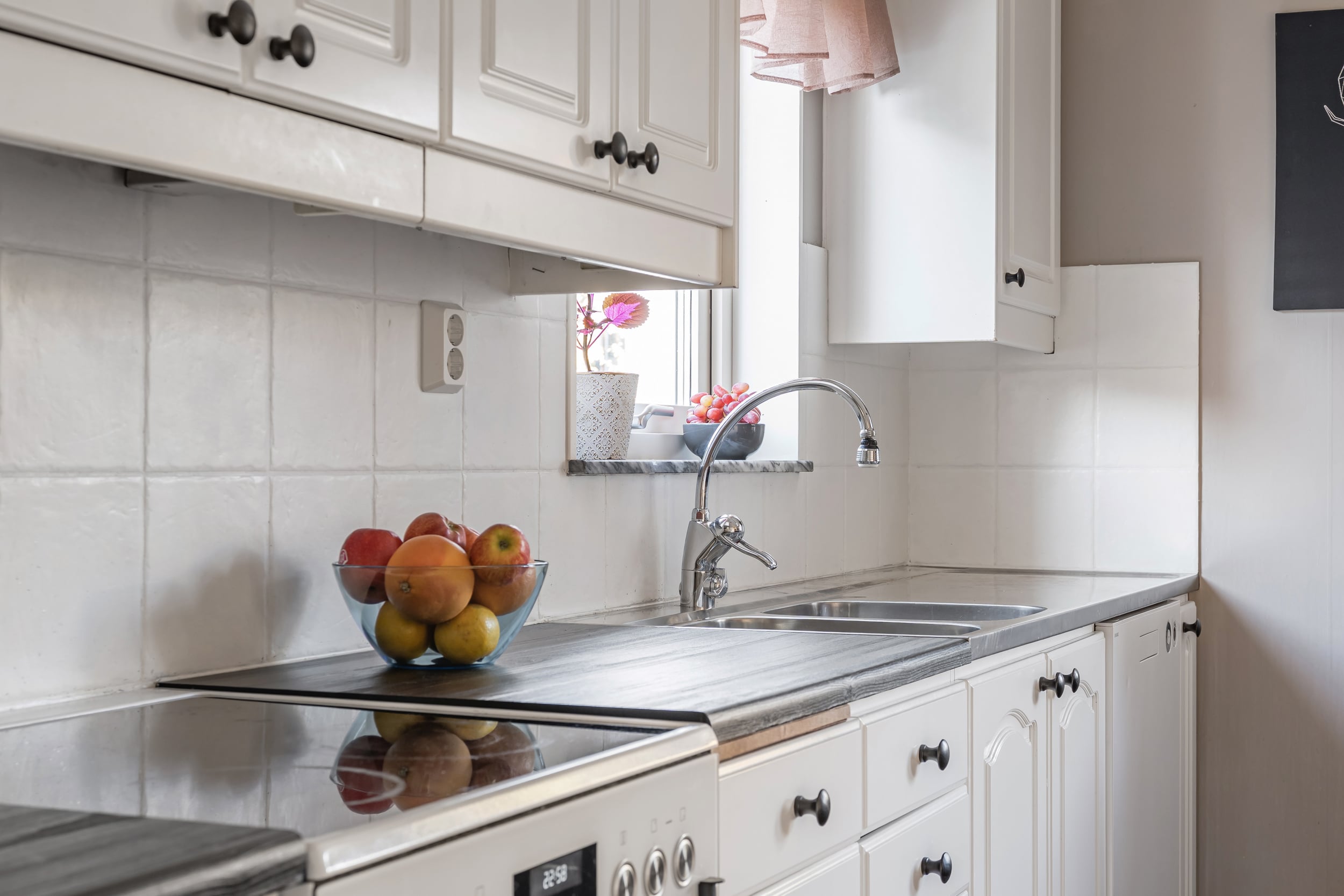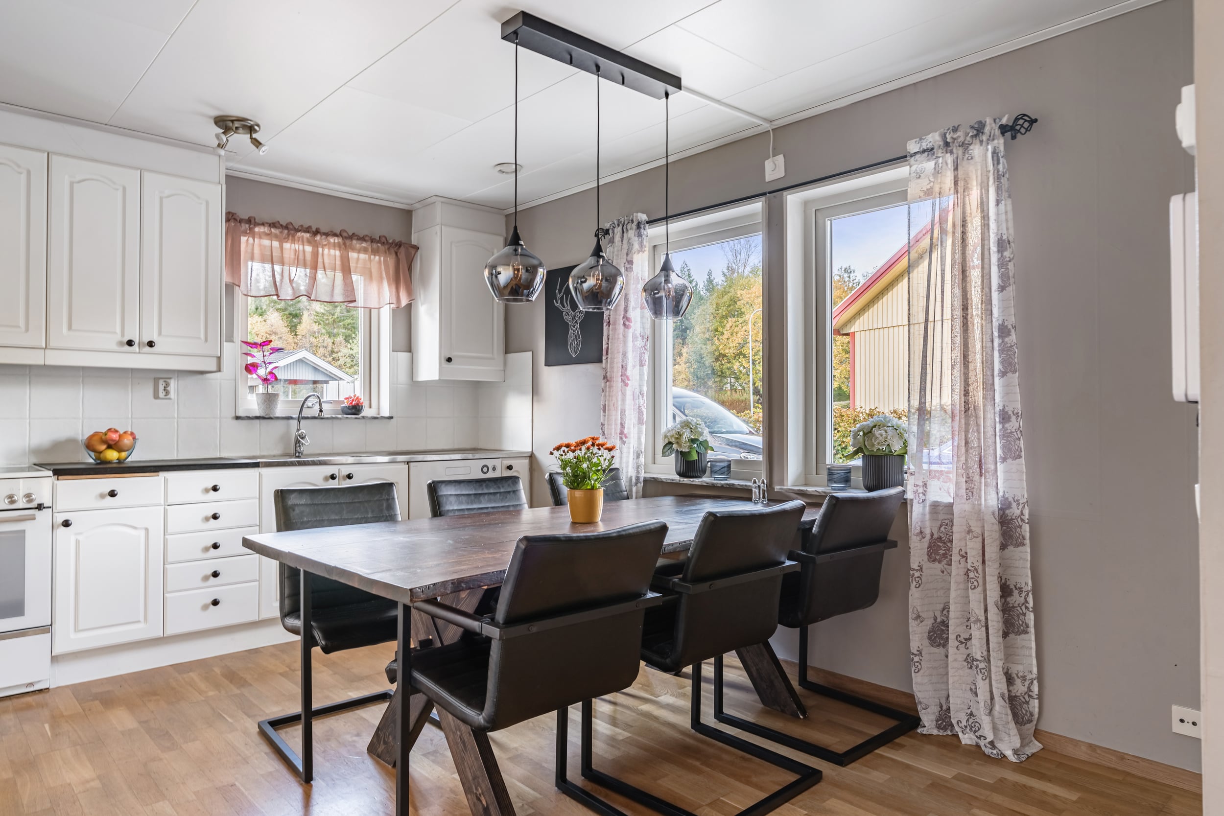 Ett generöst och inbjudande kök där parkettgolvet sträcker sig över ytan och skapar en varm känsla. Väggarna är målade i ljus kulör som lyfter de vita skåpluckorna och det klassiska vita kaklet ovanför arbetsbänken. Fullt utrustat med ugn med spishäll, diskmaskin, kyl och frys – här finns allt för både vardagsmatlagning och festliga middagar. Förvaringen är genomtänkt med gott om skåp och lådor, och det finns plats för ett stort matbord där familj och vänner kan samlas.