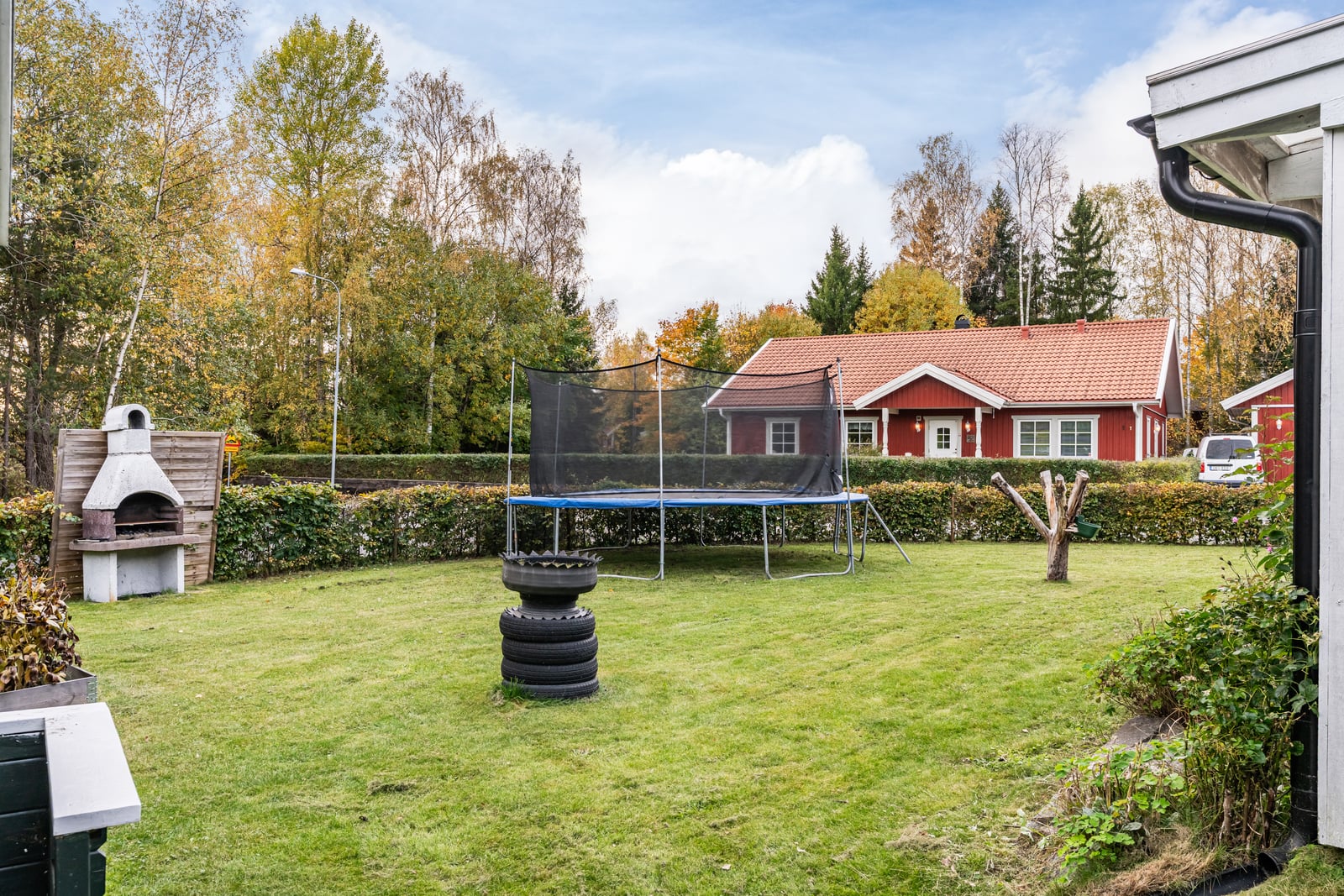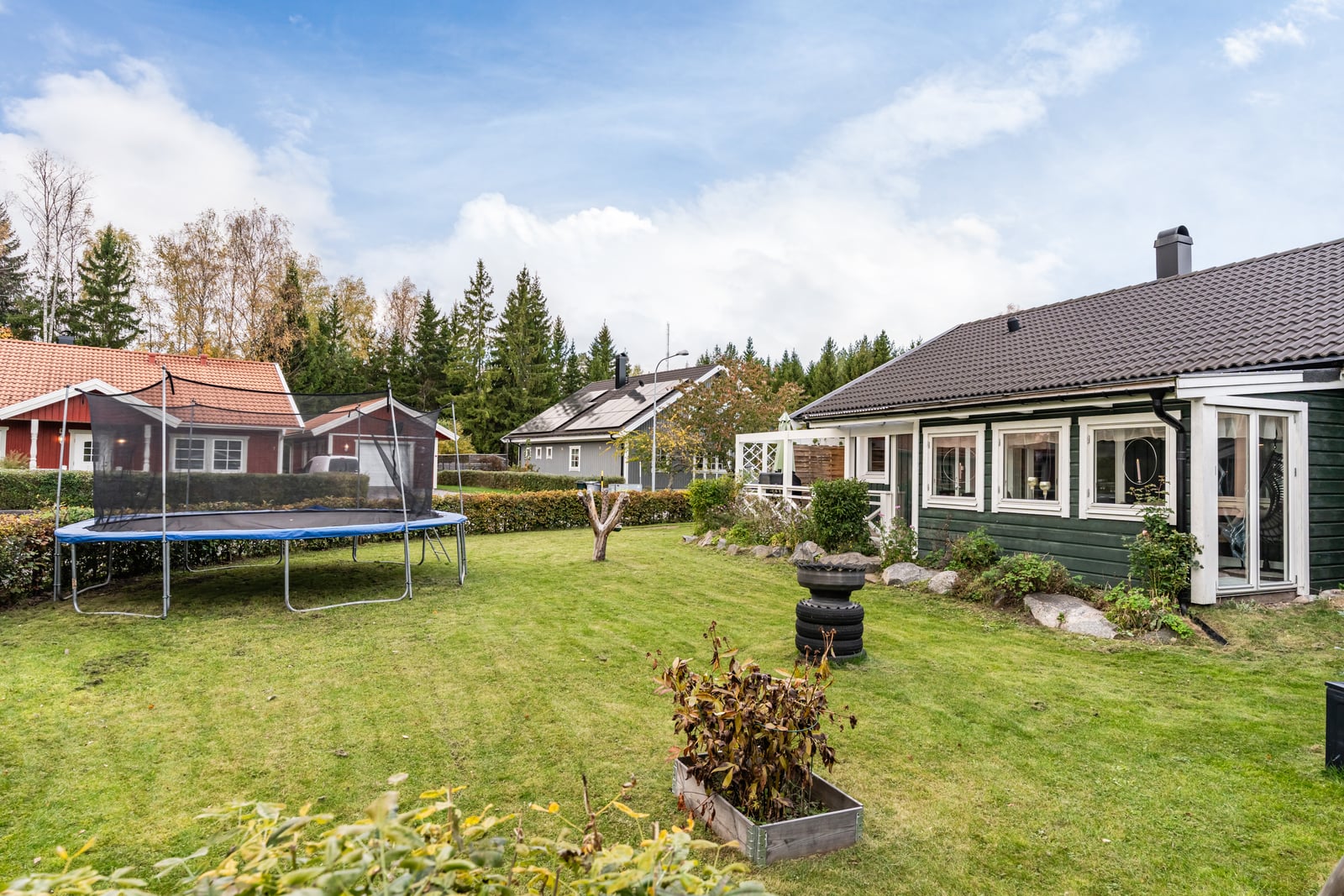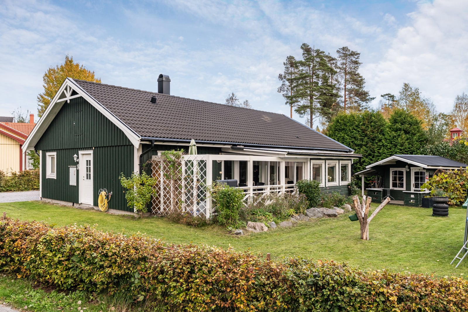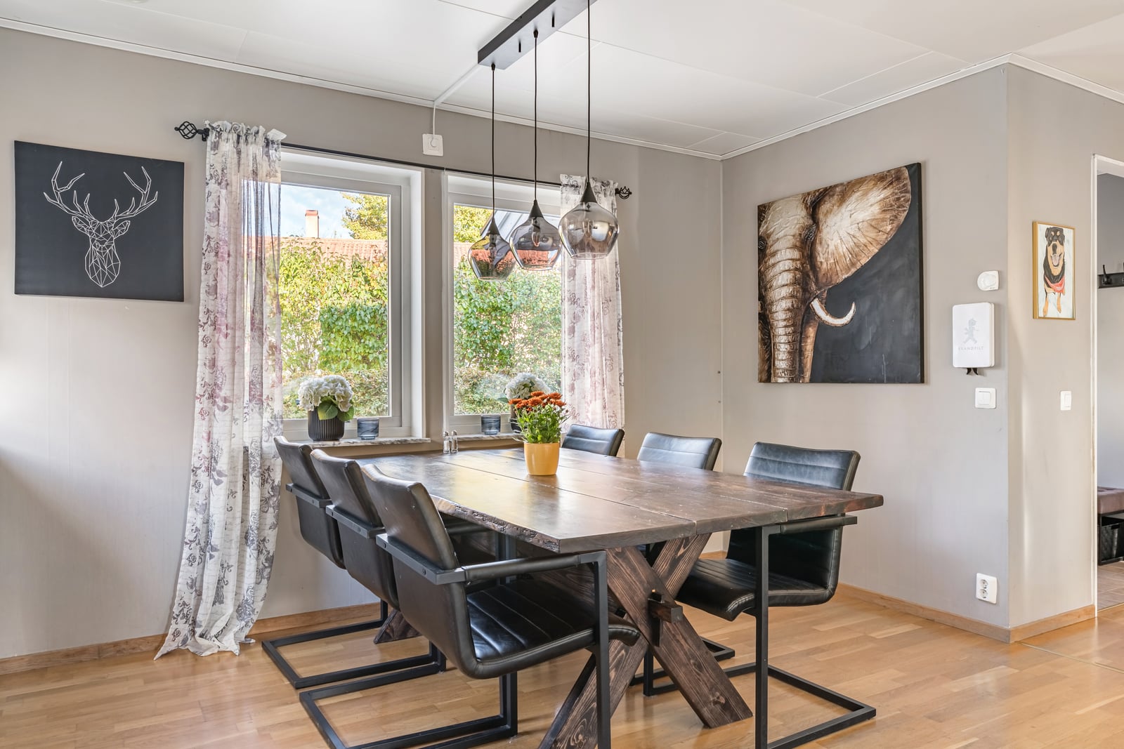 Luftigt och ljust vardagsrum med vacker parkett och målade väggar som skapar en lugn atmosfär. En braskamin ger både värme och mysfaktor under årets kallare månader. Härifrån når du det inglasade uterummet – perfekt för långa kvällar och avkoppling året runt.