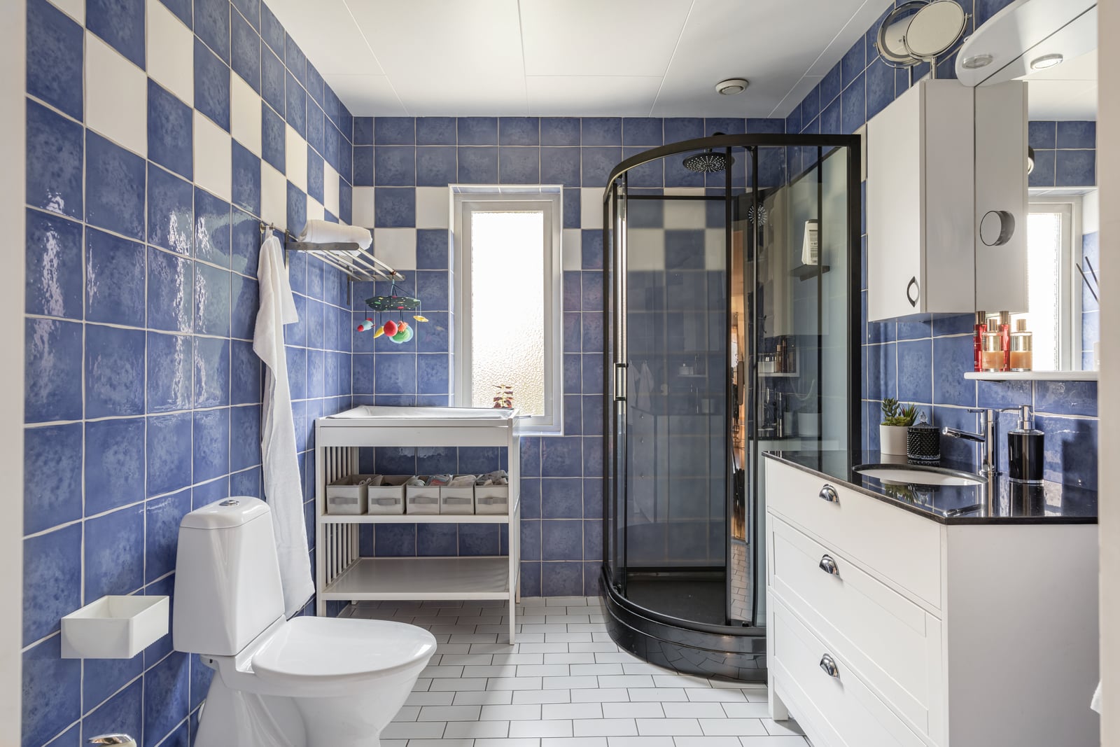 Smakfullt helkaklat badrum i blått och vitt som ger en fräsch känsla. Utrustat med duschkabin med takdusch, stilren kommod med handfat och spegel ovan samt wc. Funktionellt och elegant.